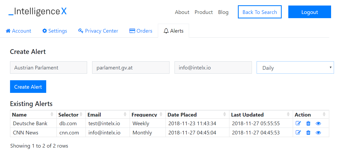 The alert feature is free for everyone. Sign up at intelx.io/signup and then go to the “Alert” tab under “Account”.