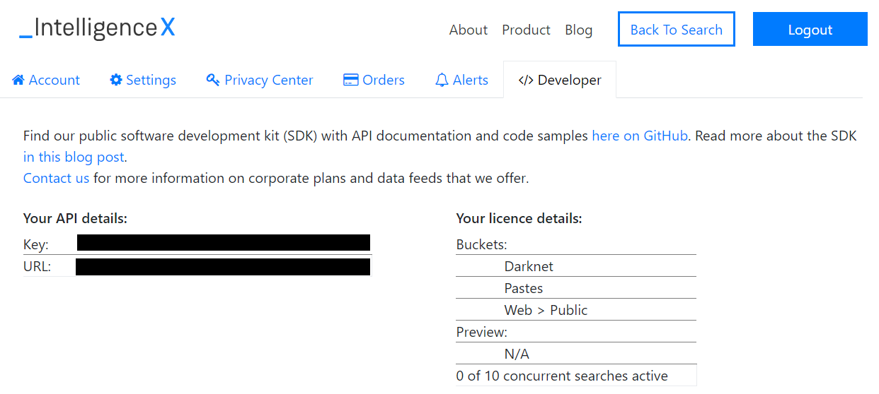 The SDK with the API documentation is published here: github.com/IntelligenceX/SDK. We want to be transparent and clear of any restrictions and limitations and thus decided to create a new developers tab to assist developers understand limitations and of the API access that we provide.