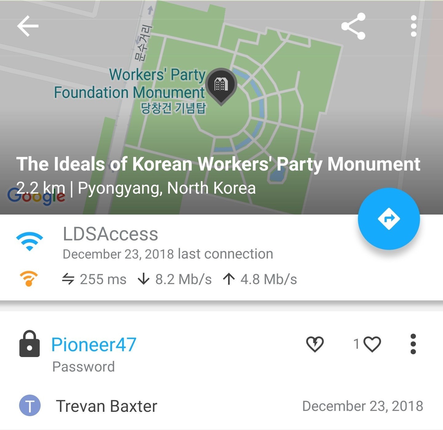 It is worth noting that the WiFi name “LDSAccess” with the password “Pioneer47” is used as a default in LDS churches, aka, the Mormon Church. Why this would pop up in North Korea can only be speculated.