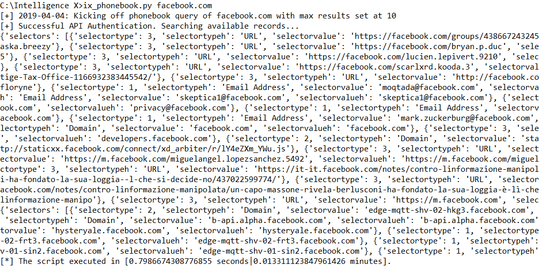 The second script “ix_phonebook.py” makes a phonebook lookup, i.e. it lists all selectors known for the search term. In the example below, it lists known email addresses, URLs, and domains belonging to facebook.com.