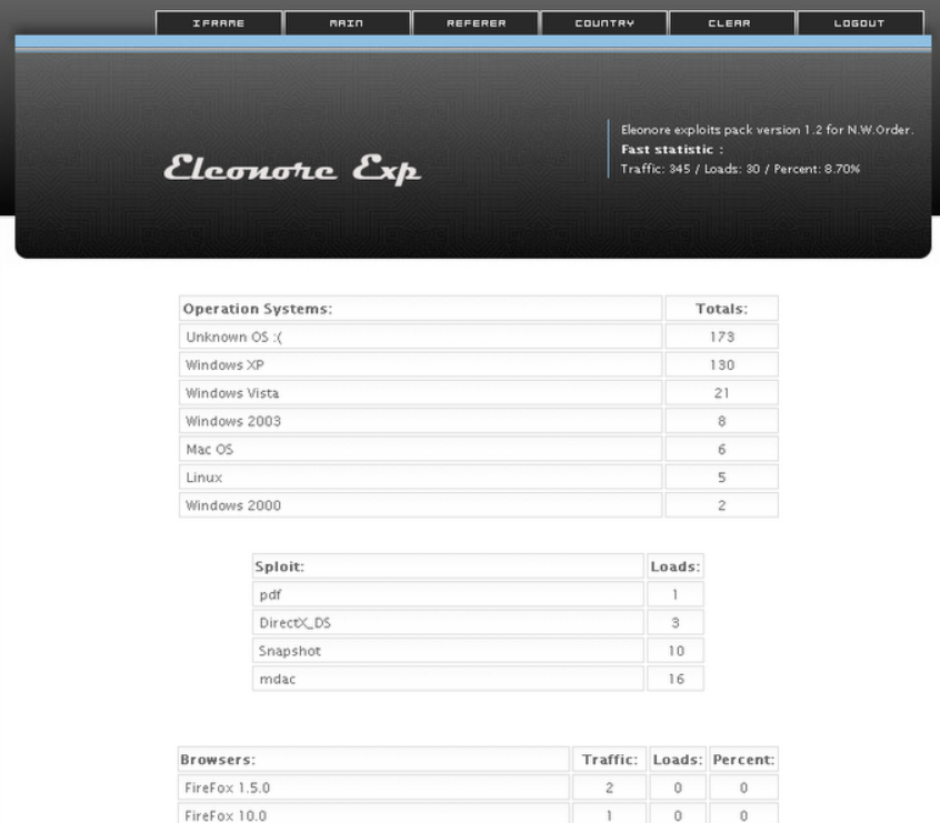 Below is a screenshot from the link posted before. It shows the admin panel of the Eleonore Exploit Pack. It lists the visitors with their operating systems and browsers, and the exploits delivered.