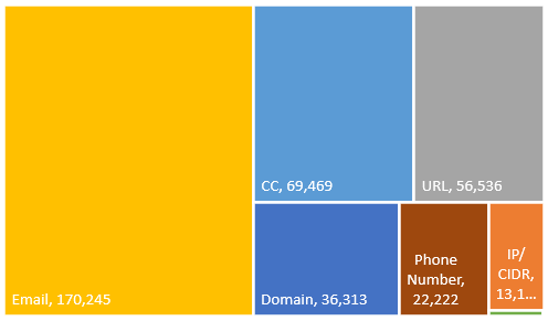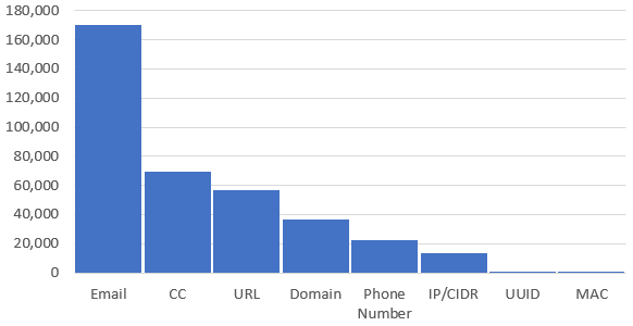 Out of the 368k unique selectors, most are – not surprisingly – email addresses with 46%. Next is Credit Cards with 19% followed by URLs 15%.