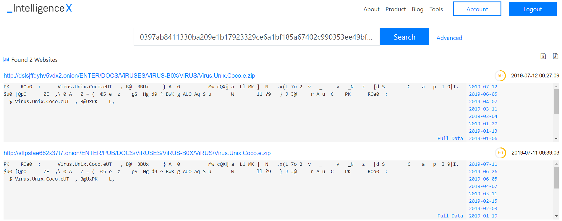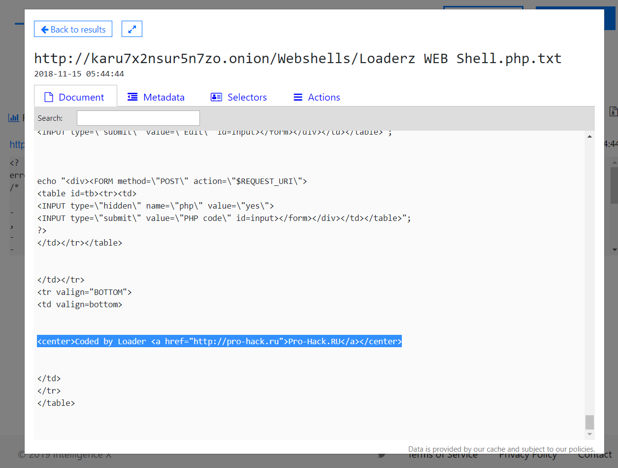 One detection is “PHP/WebShell.NBJ trojan” at the URL “http://karu7x2nsur5n7zo.onion/Webshells/Loaderz WEB Shell.php.txt”: intelx.io/?did=d23a4e23-e82a-43e1-9831-526b89331222