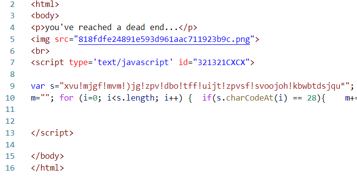 All it shows to the end-user is “You’ve reached a dead end…”. However, by looking at the HTML code, you can immediately find suspicious JavaScript code: