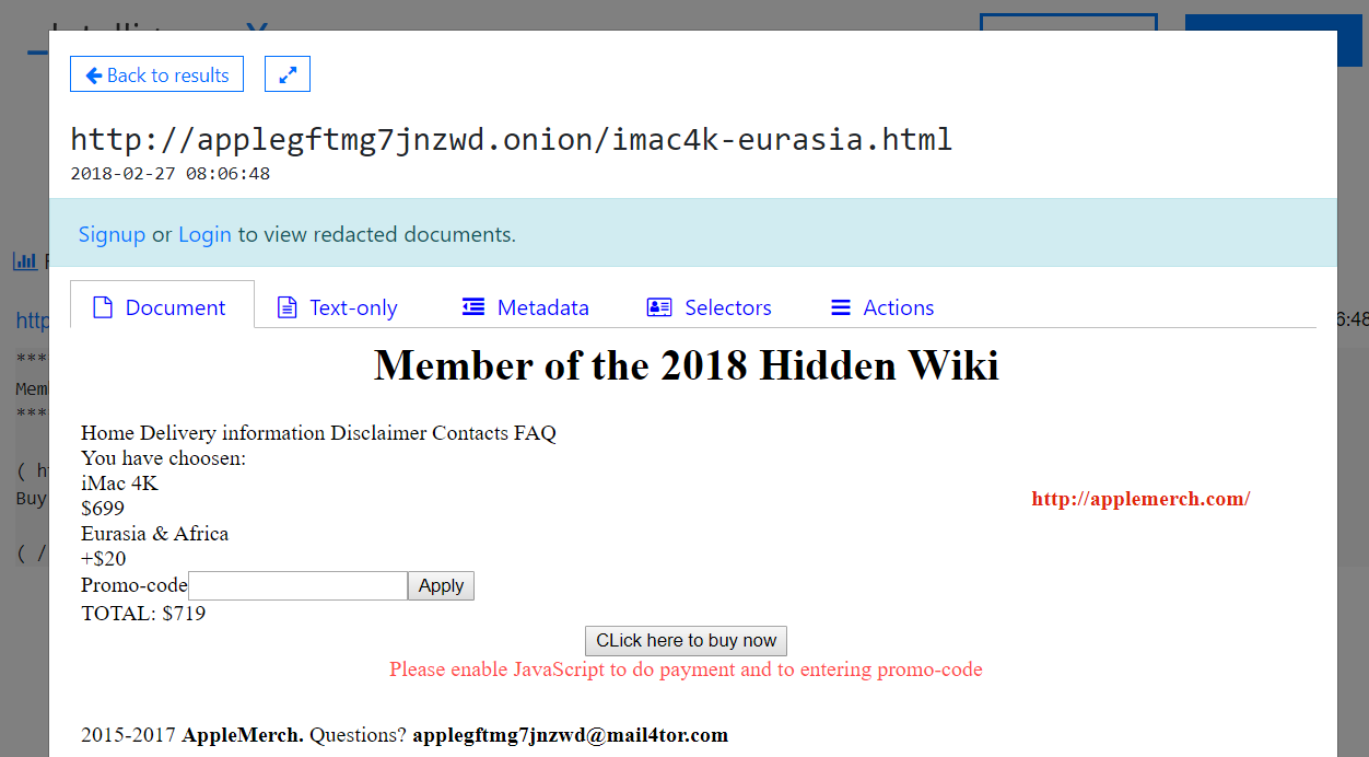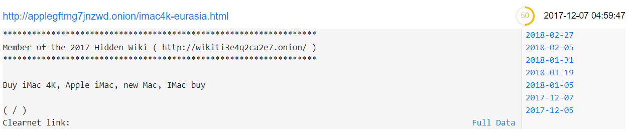 The first result is “HTML/TrojanDownloader.IFrame trojan” on the website http://applegftmg7jnzwd.onion/imac4k-eurasia.html: intelx.io/?did=9207044b-0501-4bc2-afa4-de8902633381 (visiting historical copies on Intelligence X is always safe, as we remove JavaScript and other potential malicious parts).