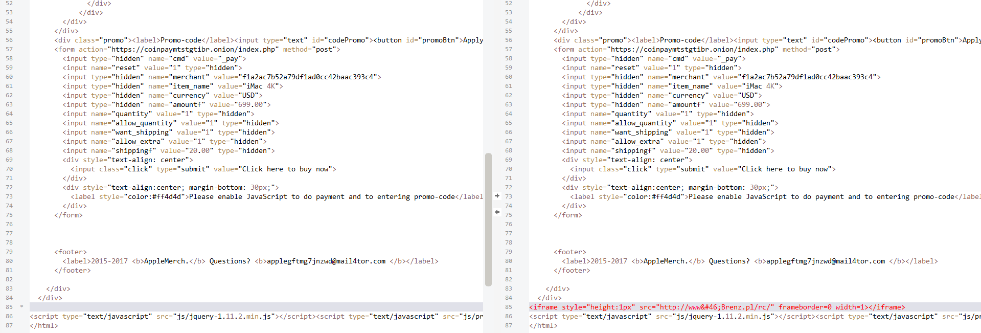 With the latest version of the website, and the one identified as malicious by ESET, a comparison can be made: