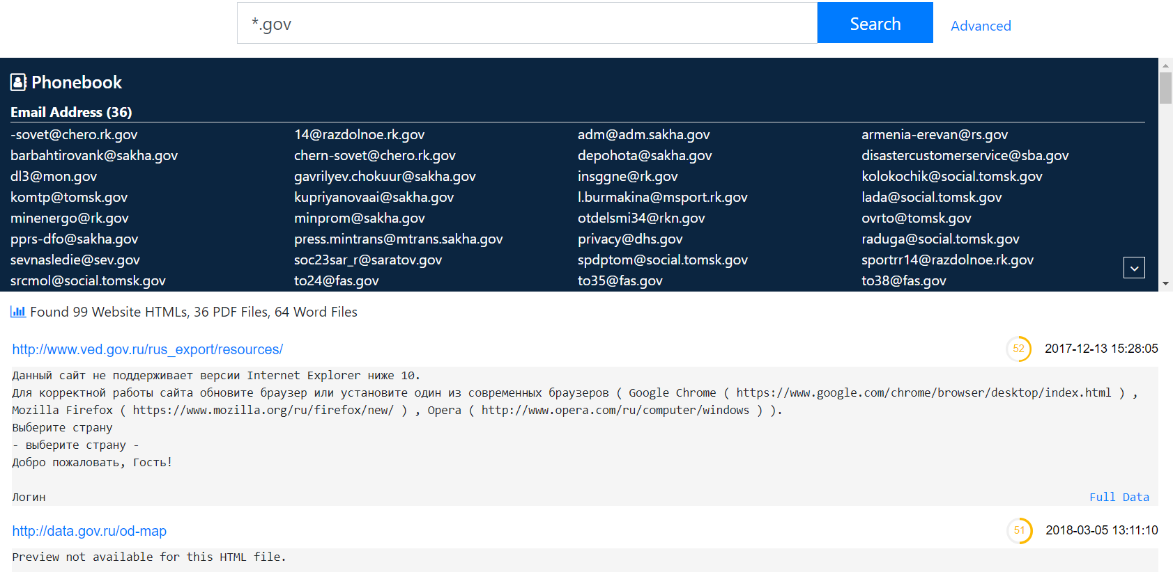 - Search for any mention of “.gov” domain names, email addresses or URLs on any Russian governmental website and list the results: intelx.io/?s=*.gov&b=web.gov.ru&pb=1&g=1