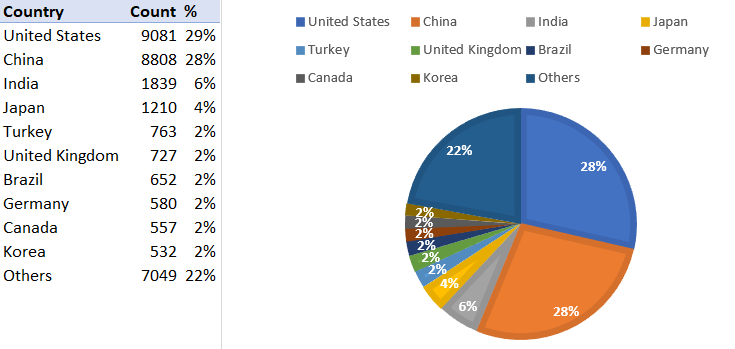 However, the other 25% is not whois protected. Here is a breakdown by registrant country: