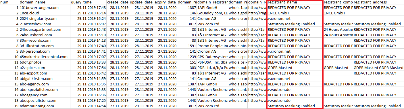 We recently indexed the whois data for October, November, and December 2019 which resulted in 21,168,724 selectors. We analyzed a small sample set (1 day, 2019-11-29) and these are the results:
