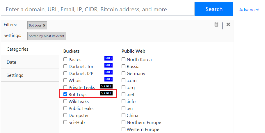 We have added the new category “Bot Logs”. It contains data collected by and leaked from viruses such as Azorult. Such data is often sold on marketplaces such as the Genesis Market. We decided to index such data into this new category to help filtering out relevant results.