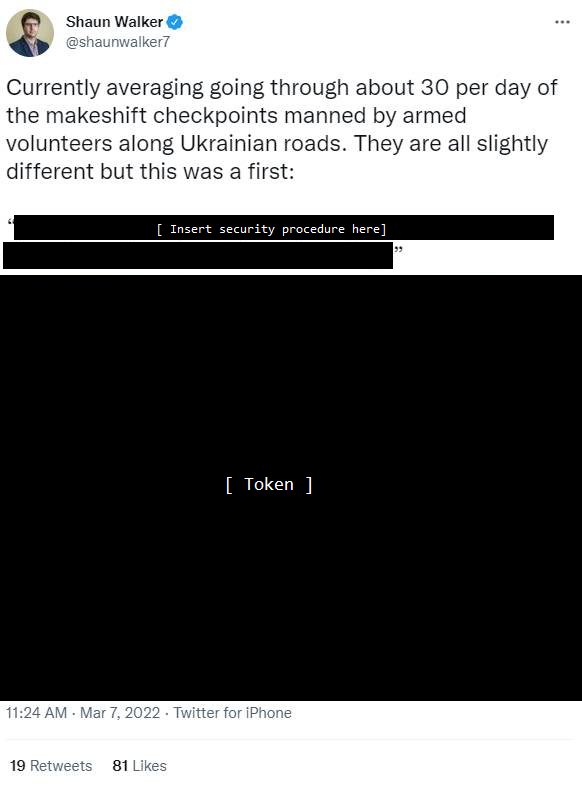 Earlier today at 11:24 The Guardian Journalist Shaun Walker posted the security procedure and the security token used to pass makeshift checkpoints in Ukraine related to the Russian Ukrainian war: