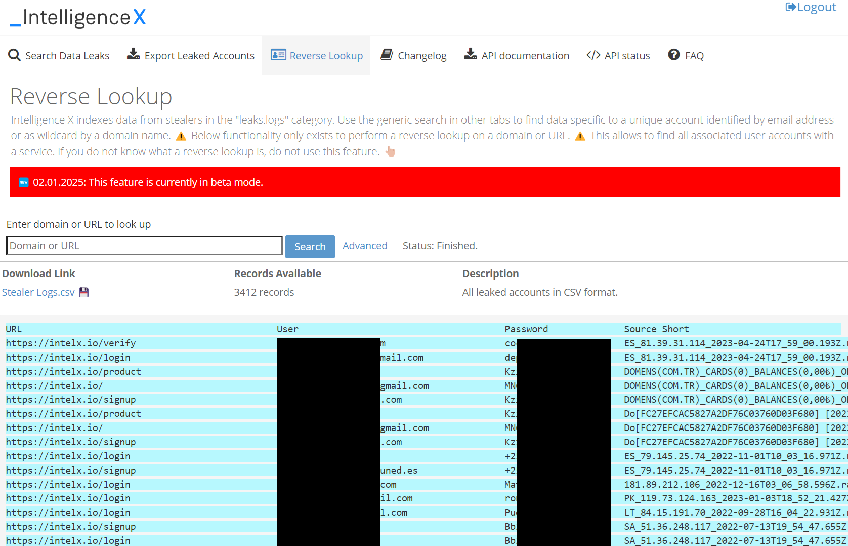 Previously you would have to manually search for the domain or URL and click through potentially hundreds or thousands of results. This feature exclusively searches the Stealer Logs data and is currently in beta mode. We will improve the algorithms over time to cover different formats of the Stealer Logs data.