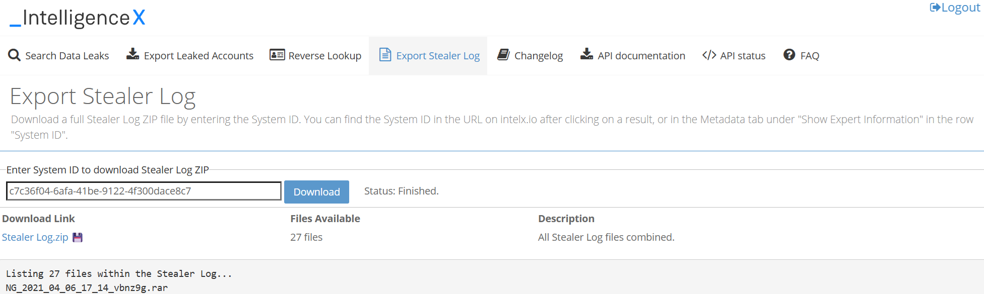We’ve added a new feature to the Identity Portal: Export Stealer Log. Previously, downloading a complete Stealer Log required multiple individual file downloads.